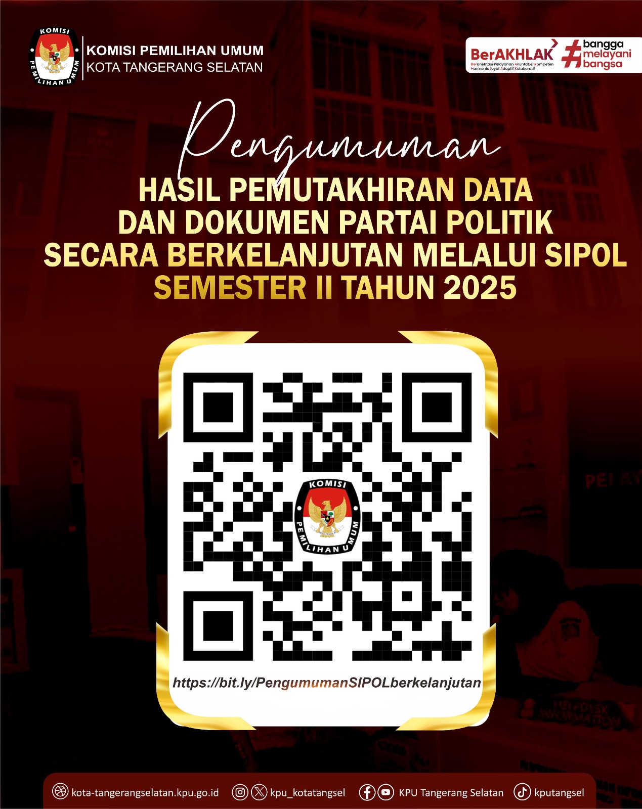 Komisi Pemilihan Umum (KPU) Kota Tangerang Selatan mengumumkan Hasil Pemutakhiran Data dan Dokumen Partai Politik Secara Berkelanjutan melalui Sistem Informasi Partai Politik (SIPOL) Semester II Tahun 2025 sebagai wujud keterbukaan informasi publik. Pengumuman ini memuat hasil pembaruan data kepengurusan, keanggotaan, serta kelengkapan dokumen partai politik yang telah disampaikan dan diproses sesuai dengan ketentuan peraturan perundang-undangan. Masyarakat dan pihak terkait dapat mengunduh dokumen pengumuman tersebut melalui tautan berikut: https://bit.ly/PengumumanSIPOLberkelanjutan, sebagai bentuk transparansi dan akuntabilitas KPU Kota Tangerang Selatan dalam pengelolaan data partai politik