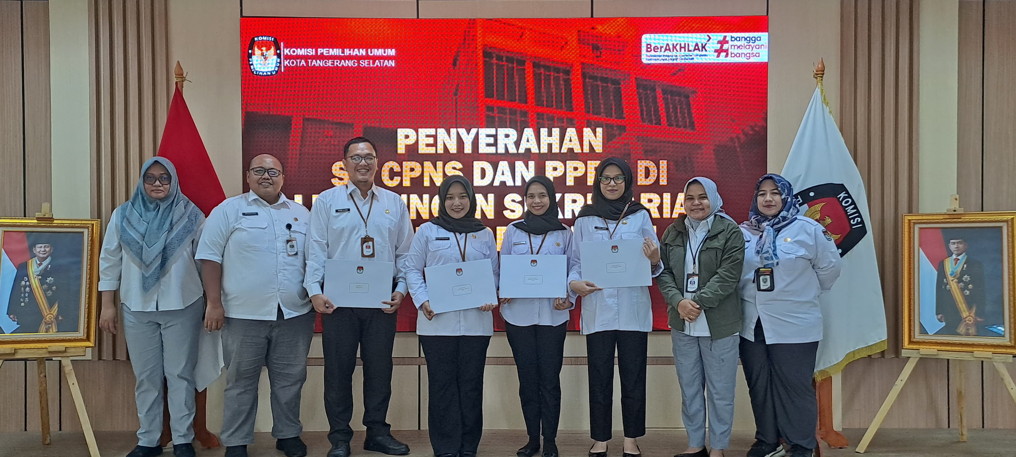 Komisi Pemilihan Umum (KPU) Kota Tangerang Selatan melaksanakan kegiatan Penyerahan SK Calon Pegawai Negeri Sipil (CPNS) dan Pegawai Pemerintah dengan Perjanjian Kerja (PPPK) di Lingkungan Sekretariat KPU Kota Tangerang Selatan pada hari Senin (30/06/2025) di aula lantai 2 (dua) gedung KPU Kota Tangerang Selatan.
