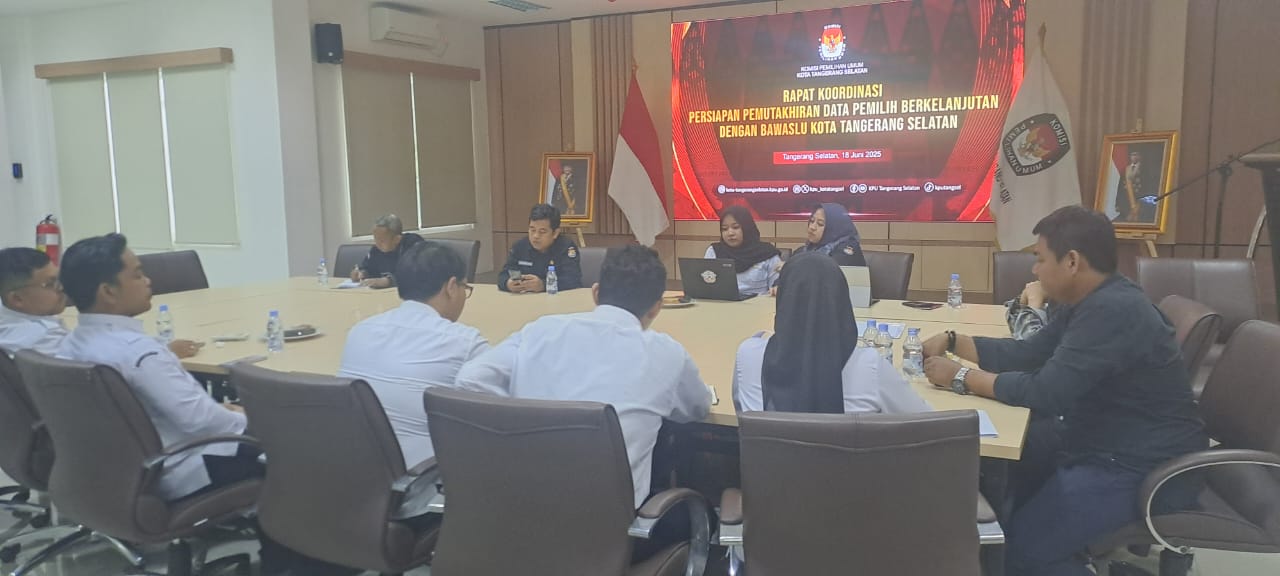 Pada hari Rabu (18/06/2025) Ketua Divisi Perencanaan, Data dan Informasi Widya Victoria M, Kasubbag Perencanaan Data dan Informasi Firsa Gemilang beserta Staf KPU Kota Tangerang Selatan melaksanakan Rapat Koordinasi Persiapan Pemutakhiran Data Pemilih Berkelanjutan dengan Bawaslu Kota Tangerang Selatan di aula lantai 2 (dua) gedung KPU Kota Tangerang Selatan.