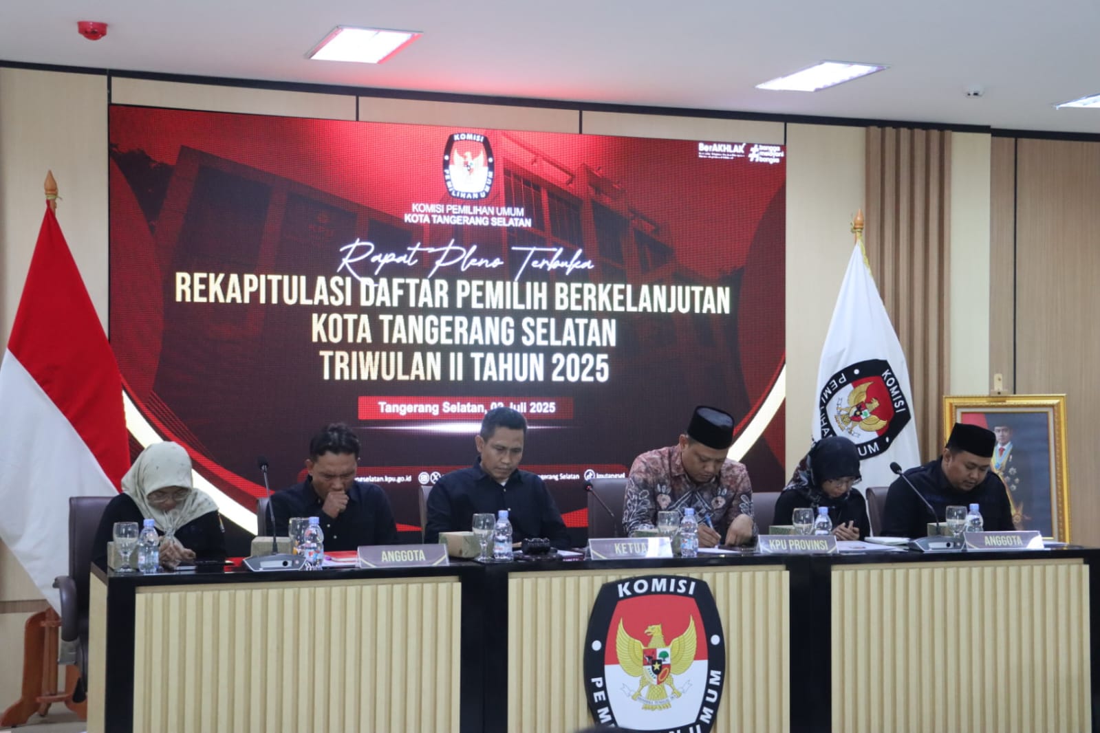 Komisi Pemilihan Umum (KPU) Kota Tangerang Selatan menetapkan jumlah daftar pemilih berkelanjutan (DPB) sebanyak 1.067.223 orang dalam Rapat Pleno Terbuka Pemutakhiran Data Pemilih Berkelanjutan (PDPB) Triwulan II Tahun 2025, yang digelar pada Rabu (2/7) di Aula Kantor KPU Kota Tangerang Selatan.
