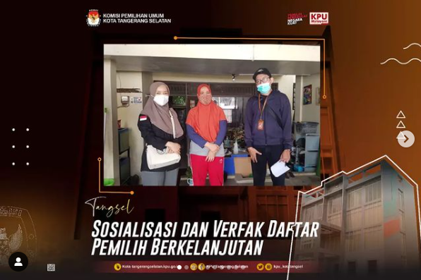KPU Kota Tangerang Selatan melaksanakan kegiatan Verifikasi Faktual terhadap data hasil pencermatan di setiap Kecamatan pada data pemilih berkelanjutan sejak tanggal 27-28 September 2021 yang tersebar di 7 Kecamatan, Kota Tangerang Selatan. selain melaksanakan Verfikasi Faktual KPU Kota Tangerang Selatan berkoordinasi sekaligus mensosialisasikan kegiatan Pemutakhiran Data Pemilih Berkelanjutan yang sedang dilaksakan kepada pihak kelurahan. Dalam kegiatan verifikasi Faktual, petugas KPU Tangerang Selatan dilengkapi dengan protocol kesehatan berupa masker, hand sanitizer serta menggunakan alat tulis masing-masing. Kegiatan updating data pemilih berkelanjutan dilakukan setiap sebulan sekali dan dirakorkan dengan pihak stake holder setiap 3 bulan sekali sesuai amanat KPU RI melalui surat edaran nomor : 366/PL.02-SD/01/KPU/IV/2021 perihal Pemutakhiran Data Pemilih Berkelanjutan , dengan dilakukannya pemutakhitan data pemilih berkelanjutan diharapkan dapat meminimalisir permasalahan data pemilih pada pemilu 2024 mendatang. Bagi masyarakat yang ingin mengecek hak pilihnya bisa dicek di website sipangsi.id Dokumentasi Kegiatan https://www.instagram.com/p/CUcCJHNJ9u5/