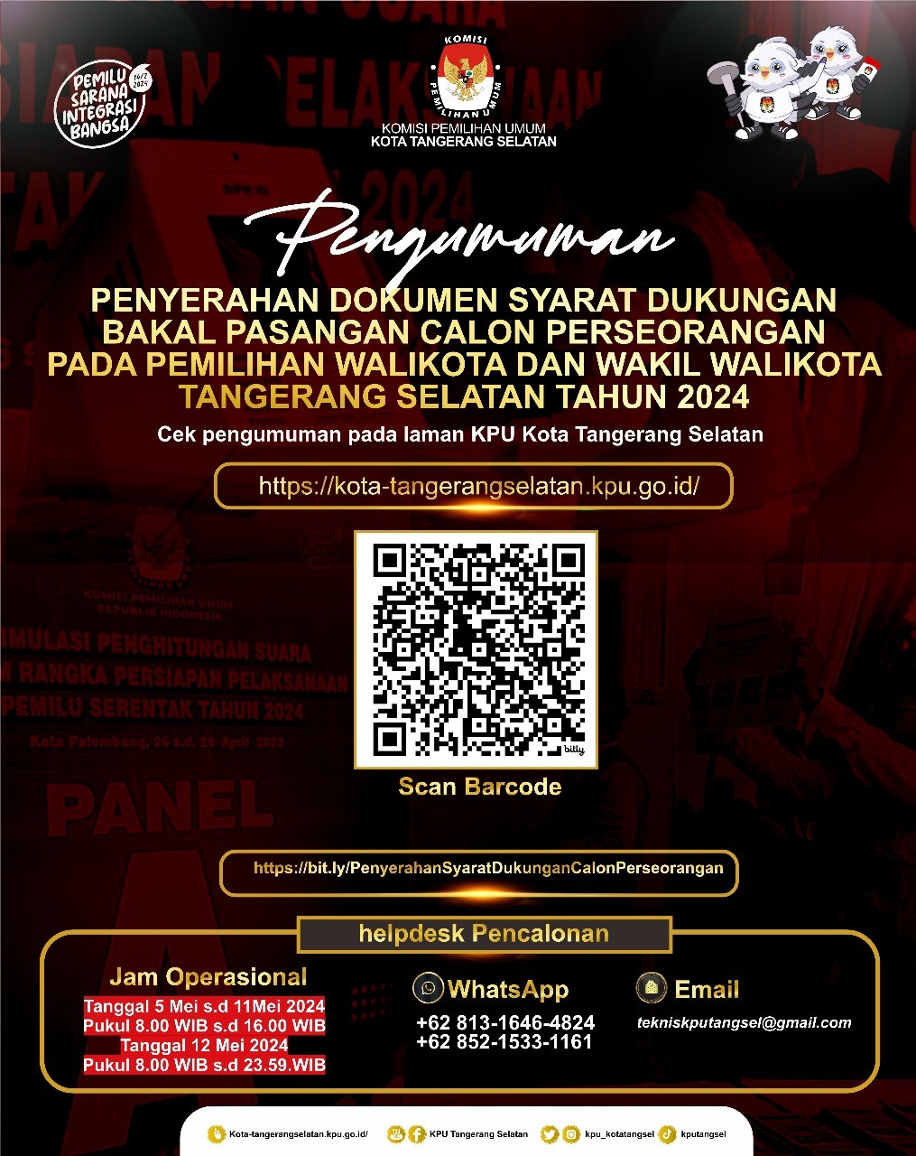 Sesuai dengan ketentuan Pasal 41 ayat (2) Undang-Undang Nomor 10 Tahun 2016 tentang Perubahan Kedua Atas Undang-Undang Nomor 1 Tahun 2015 tentang Penetapan Peraturan Pemerintah Pengganti Undang-Undang Nomor 1 Tahun 2014 tentang Pemilihan Gubernur, Bupati, dan Walikota Menjadi Undang-Undang, bahwa calon perseorangan dapat mendaftarkan diri sebagai Calon Bupati dan Calon Wakil Bupati serta Calon Walikota dan Calon Wakil Walikota, jika memenuhi syarat dukungan jumlah penduduk yang mempunyai hak pilih dan termuat dalam Daftar Pemilih Tetap di daerah bersangkutan pada Pemilihan Umum atau Pemilihan sebelumnya yang paling akhir di daerah bersangkutan. Sehubungan dengan ketentuan tersebut, bersama ini kami sampaikan hal-hal sebagai berikut Silakan klik disini https://bit.ly/PenyerahanSyaratDukunganCalonPerseorangan