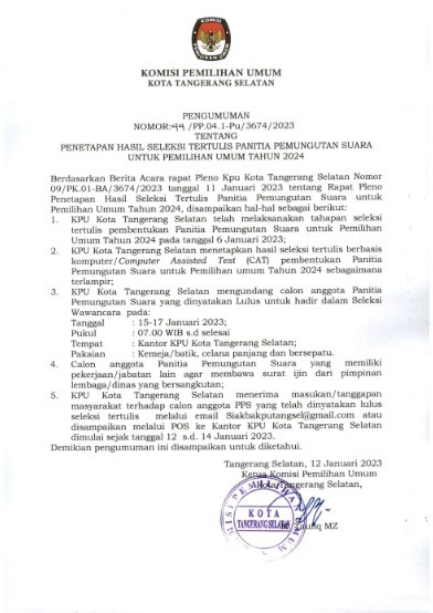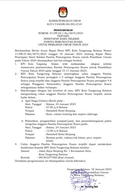 Tangerang Selatan- Komisi Pemilihan Umum (KPU) Kota Tangerang Selatan, Menetapkan sekretaris dan staff sekretariat Panitia Pemilihan Kecamatan (PPK) Se- Kota Tangerang Selatan untuk pemilihan umum tahun 2024, Rabu(11/1/23). Di Aula kantor KPU Kota Tangerang Selatan. Acara di mulai pukul 20.00 WIB s.d Selesai.