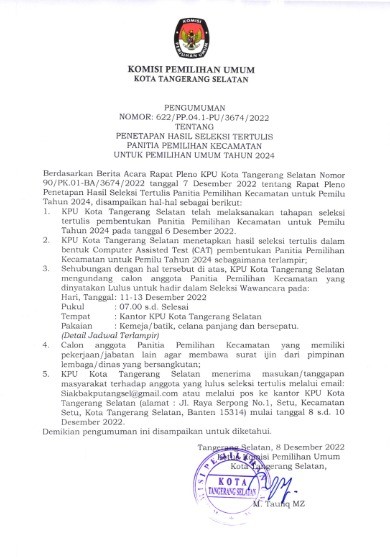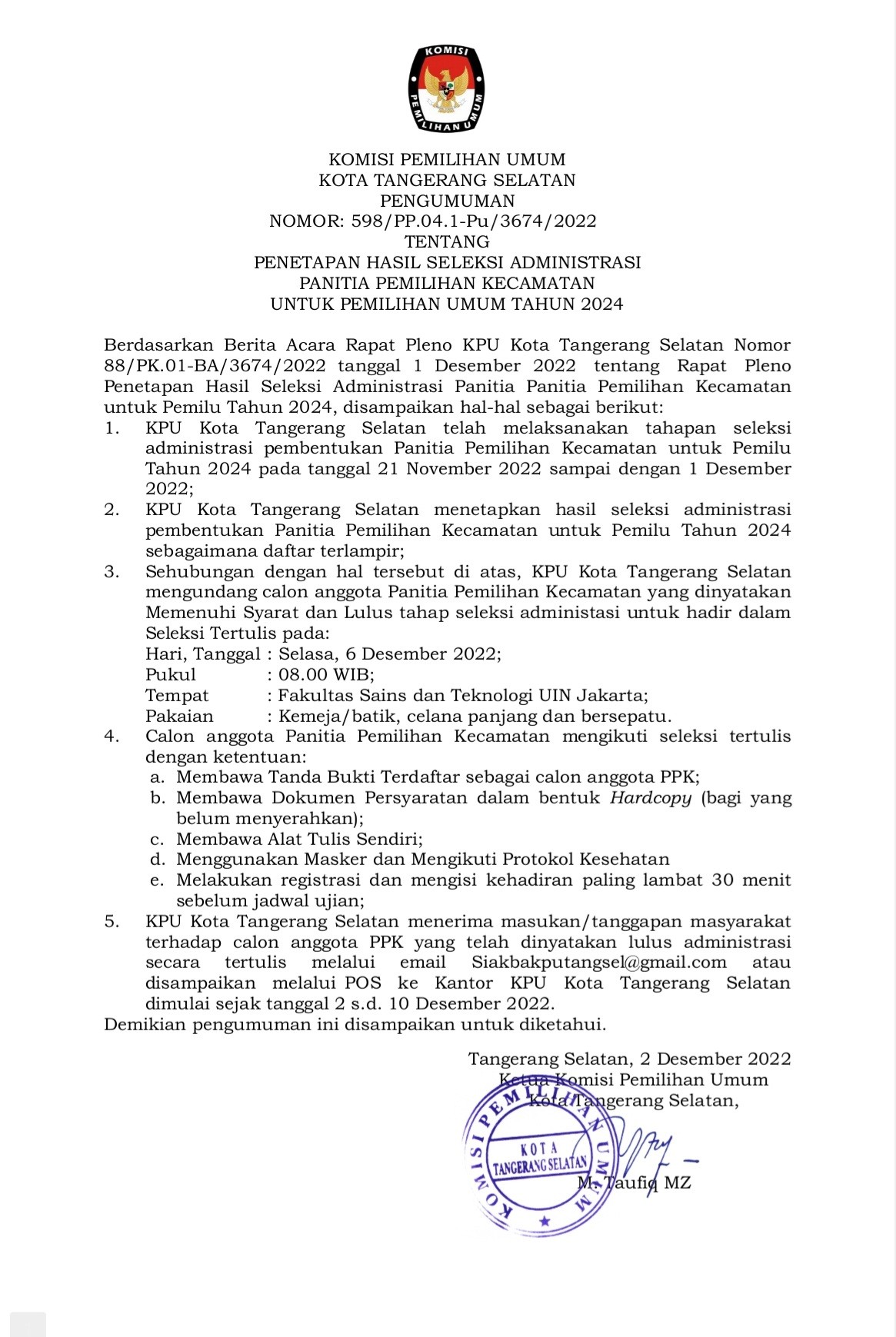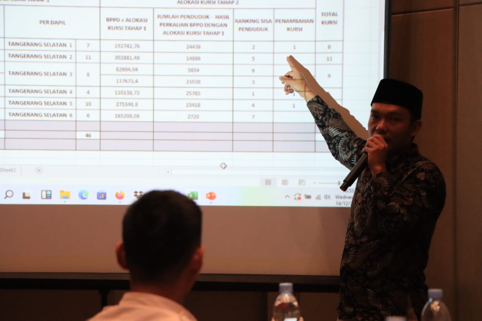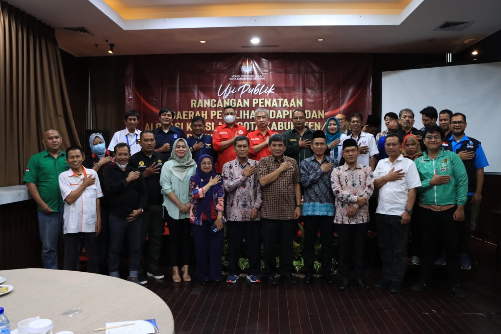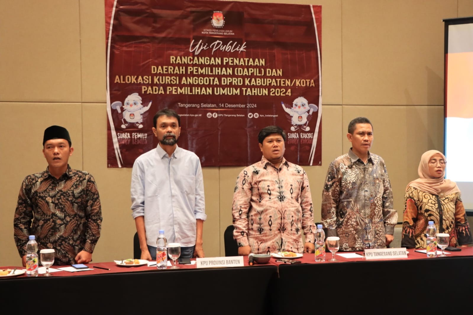 Tangerang Selatan- Komisi Pemilihan Umum (KPU) Kota Tangerang Selatan menggelar uji publik rancangan penataan daerah pemilihan (DAPIL) dan alokasi kursi anggota DPRD Kabupaten/Kota pada pemilihan umum tahun 2024, Rabu (14/12/22) di hotel Trembesi Kota Tangerang Selatan pukul 15.00 WIB. Acara dibuka oleh ketua KPU Kota Tangerang Selatan M Taufiq MZ, Andi Syafrani S. H.I sebagai narasuber, adapaun undangan yang hadir dalam sesi kedua adalah dari Kejaksaan Negeri Kota Tangerang Selatan, Kapolres Tangerang Selatan, Dandim 0506 Tangerang, Kesbangpol, Disdukcapil, Sekretaris Daerah Kota Tangerang Selatan, Sekretaris Dewan Kota Tangerang Selatan Camat Se-Kota Tangerang Selatan. Komisoner KPU Kota Tangerang Selatan Ajat Sudrajat menyampaikan Kegiatan uji publik ini dilakukan untuk meminta masukan dan tanggapan terhadap rancangan penataan daerah pemilihan (DAPIL) dan alokasi kursi anggota DPRD Kabupaten/Kota di Kota Tangerang Selatan yang nantinya akan di tetapkan oleh KPU RI sebagi dapil di pemilu 2024.