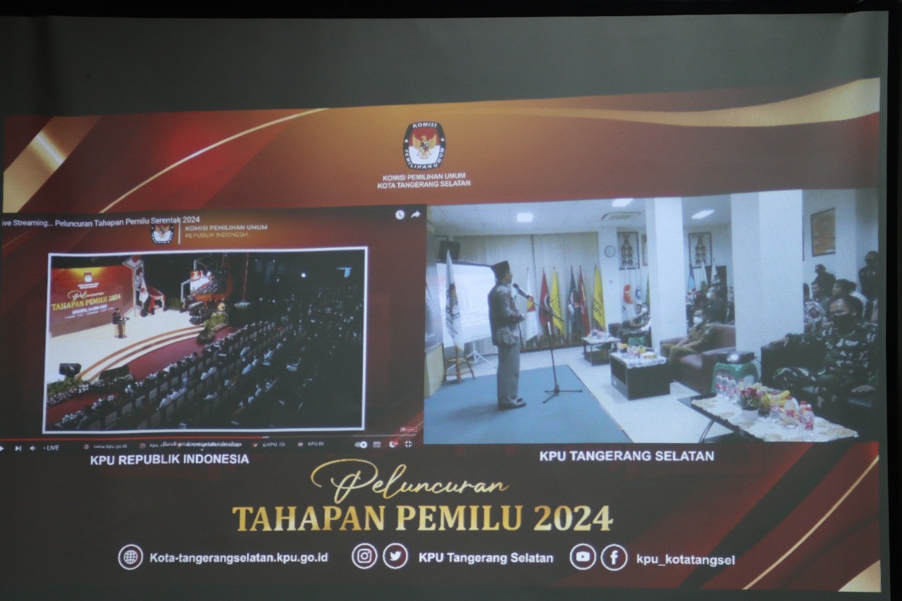 Tangerang Selatan – Kantor Komisi Pemilihan Umum (KPU) Tangsel, Secara resmi Tahapan Pemilu Serentak Tahun 2024 dimulai pada hari ini, Selasa 14 Juni 2022. KPU Kota Tangerang Selatan menyelenggarakan nonton bersama acara Peluncuran Tahapan Pemilu 2024 yang diselenggarakan oleh KPU Republik Indonesia yang juga di ikuti secara serentak seluruh KPU se Indonesia melalui Zoom Meeting. Selasa (14/6).