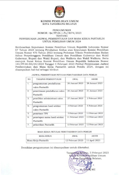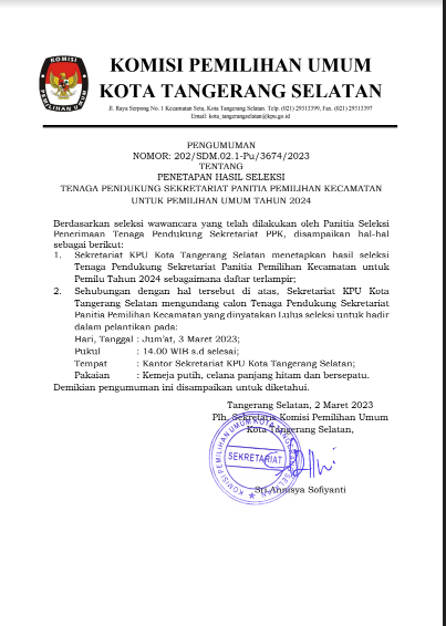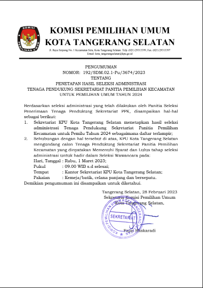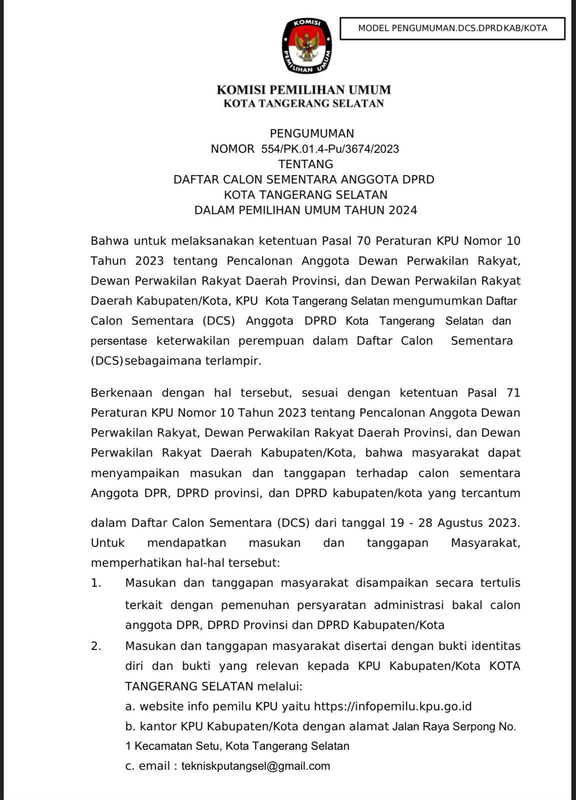 PENGUMUMAN NOMOR 554/PK.01.4-Pu/3674/2023 TENTANG DAFTAR CALON SEMENTARA ANGGOTA DPRD KOTA TANGERANG SELATAN DALAM PEMILIHAN UMUM TAHUN 2024