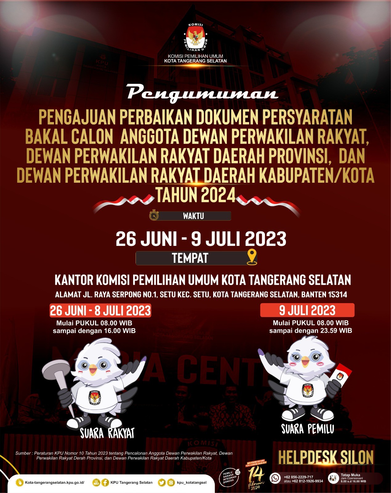 Pengumuman Pengajuan Perbaikan Dokumen Persyaratan Bakal Calon Anggota Dewan Perwakilan Rakyat, Dewan Perwakilan Rakyat Daerah Provinsi, dan Dewan Perwakilan Rakyat Daerah Kabupaten /Kota.