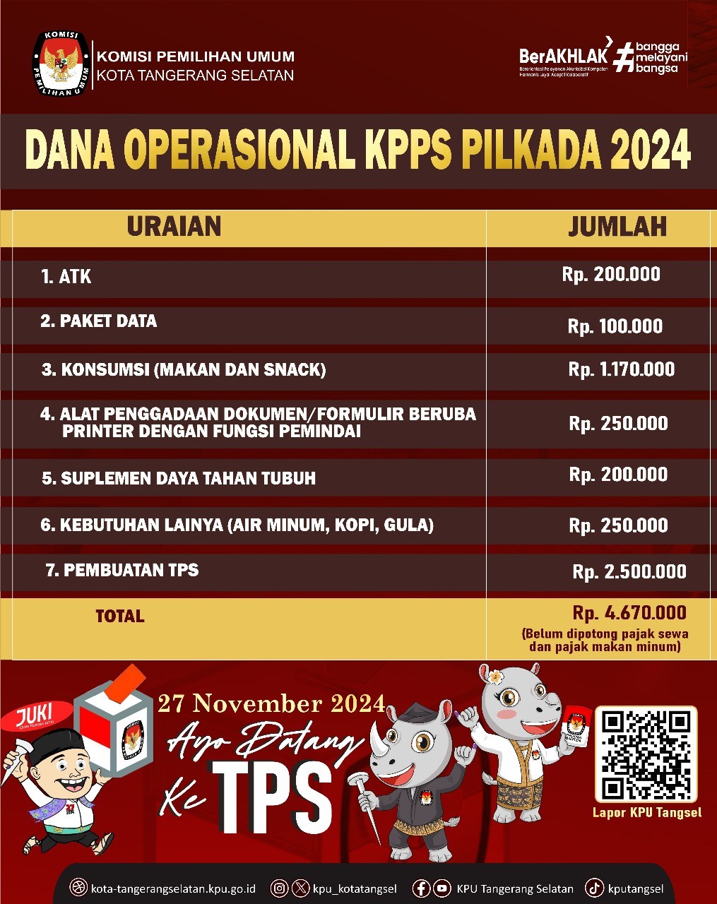 penyelenggara yah harus transparan karena ini adalah Uang negara yang diperuntukan buat kepentingan negara, bukan pribadi, inilah total Dana Operasional KPPS Pilkada 2024 per TPS Pada Pemilihan Serentak 2024 sejumlah Rp 4.670.000.