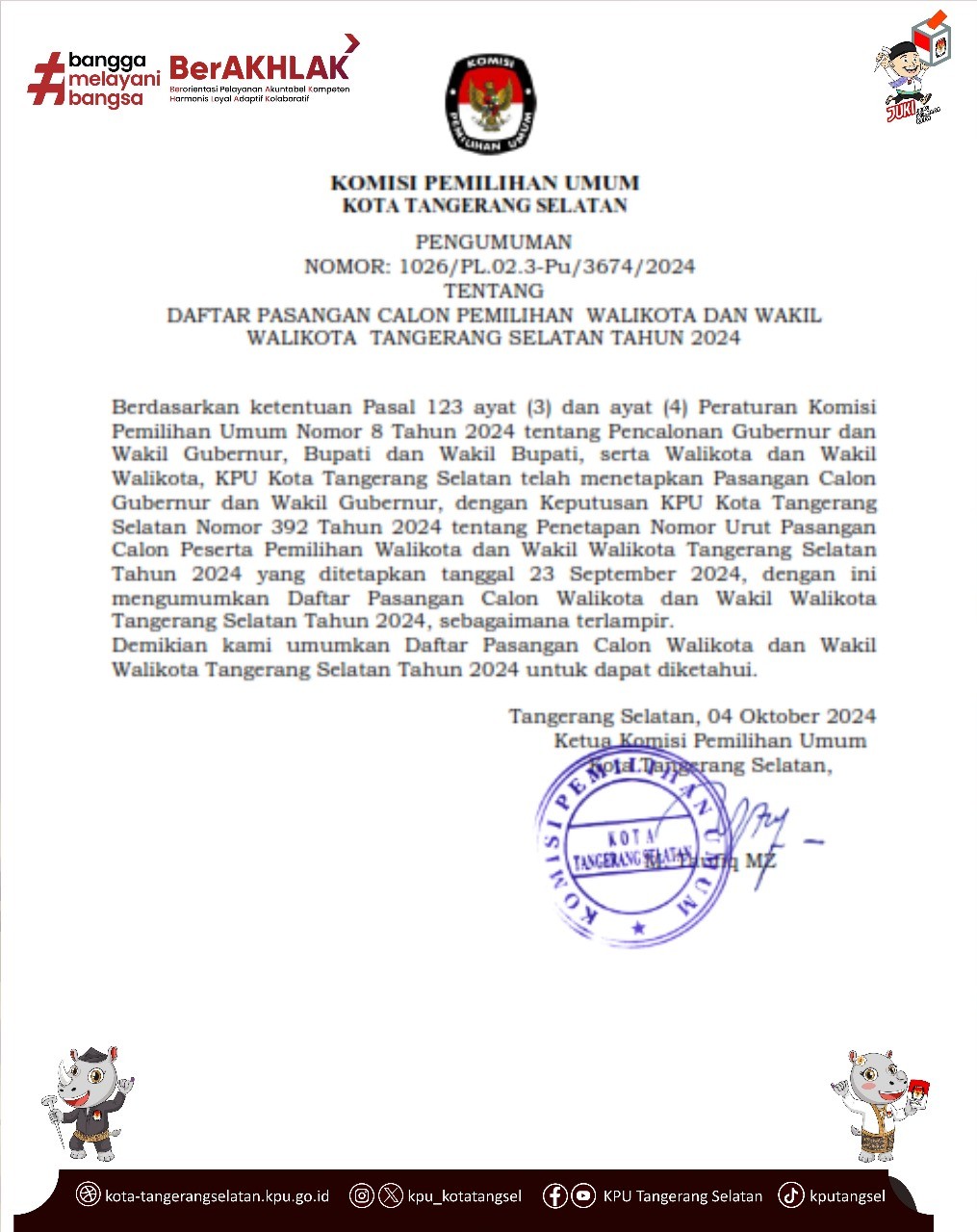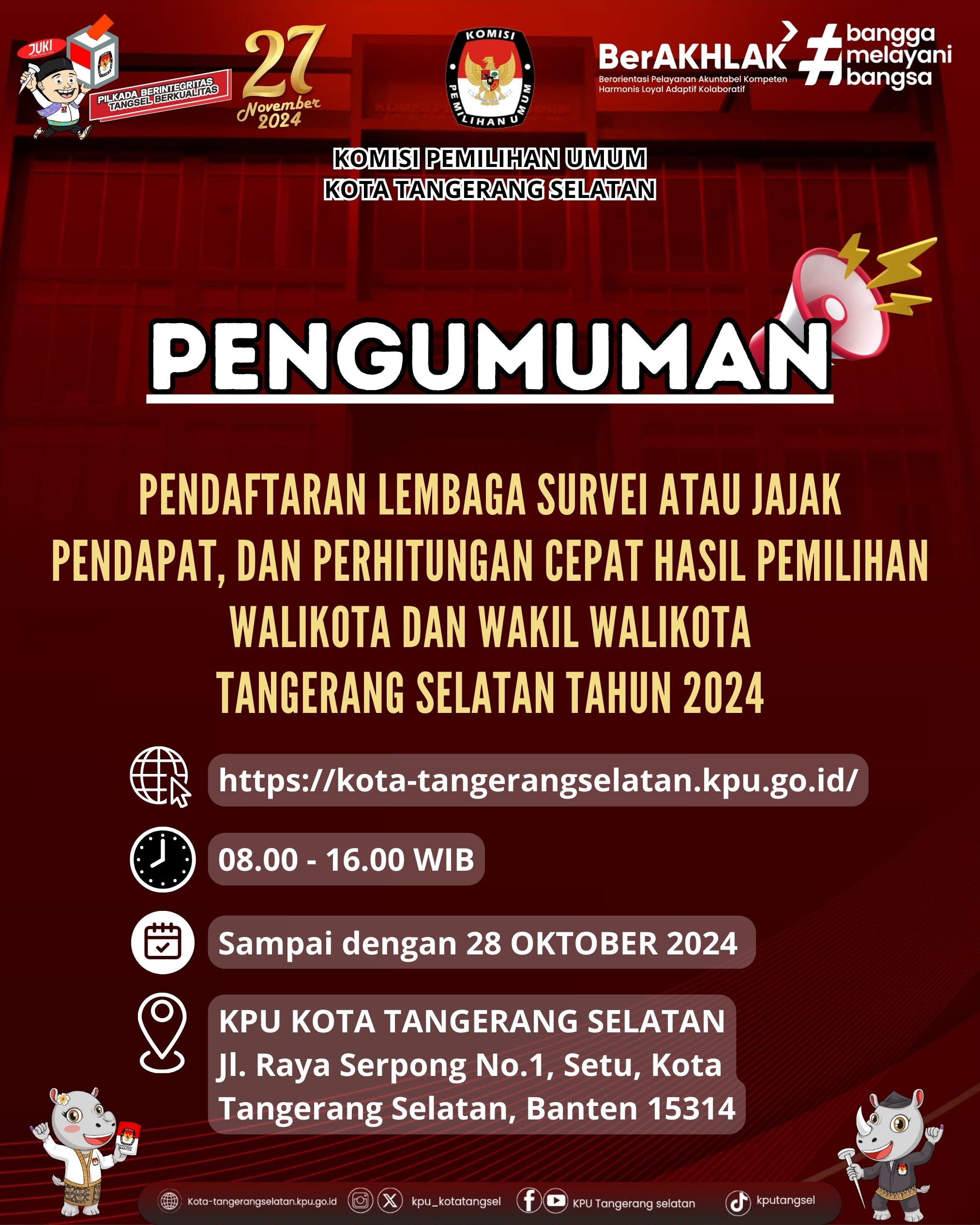 #TemanPemilih KPU Kota Tangerang Selatan membuka pendaftaran lembaga survei, dan jajak pendapat serta Penghitungan Cepat untuk Pemilihan Walikota dan Wakil Walikota 2024.
